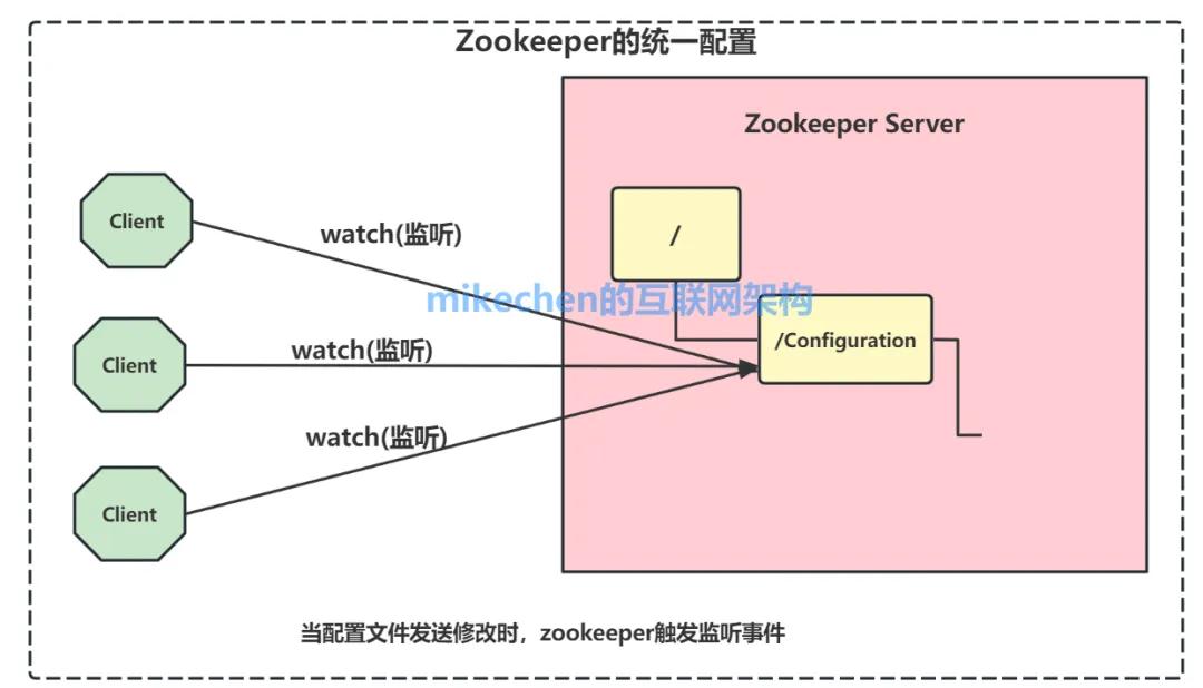 将配置信息保存在 Zookeeper 的某个目录节点中,一旦配置信息发生变化,每台应用机器就会收到 Zookeeper 的通知,然后从 Zookeeper 获取新的配置信息应用到系统中。