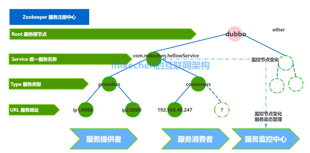 这个就是命名服务,利用 ZooKeeper创建一个全局的路径,这个路径(com.mikechen.helloService)就可以作为一个名字,产生唯一的标识。